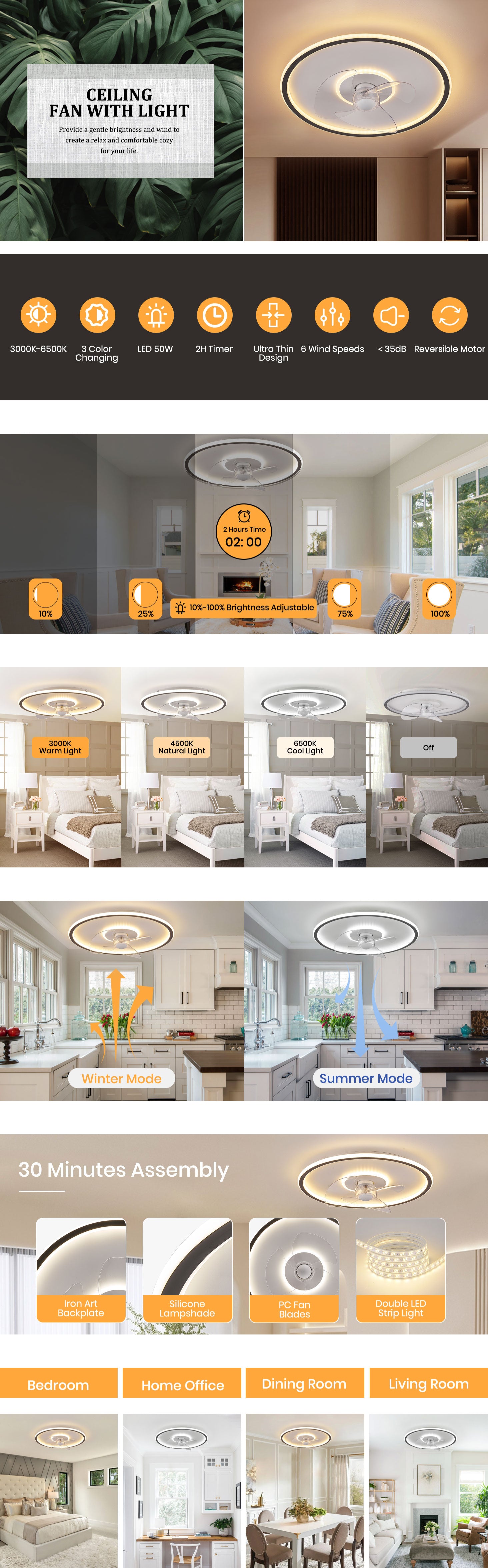 - 【Convenient App and Remote Control】Easily control all functions using the remote or app, and this low profile ceiling fan will auto-save the brightness and color temperature when turning off the light by remote or app control, ensuring that your preferences remain unchanged when turning it back on.