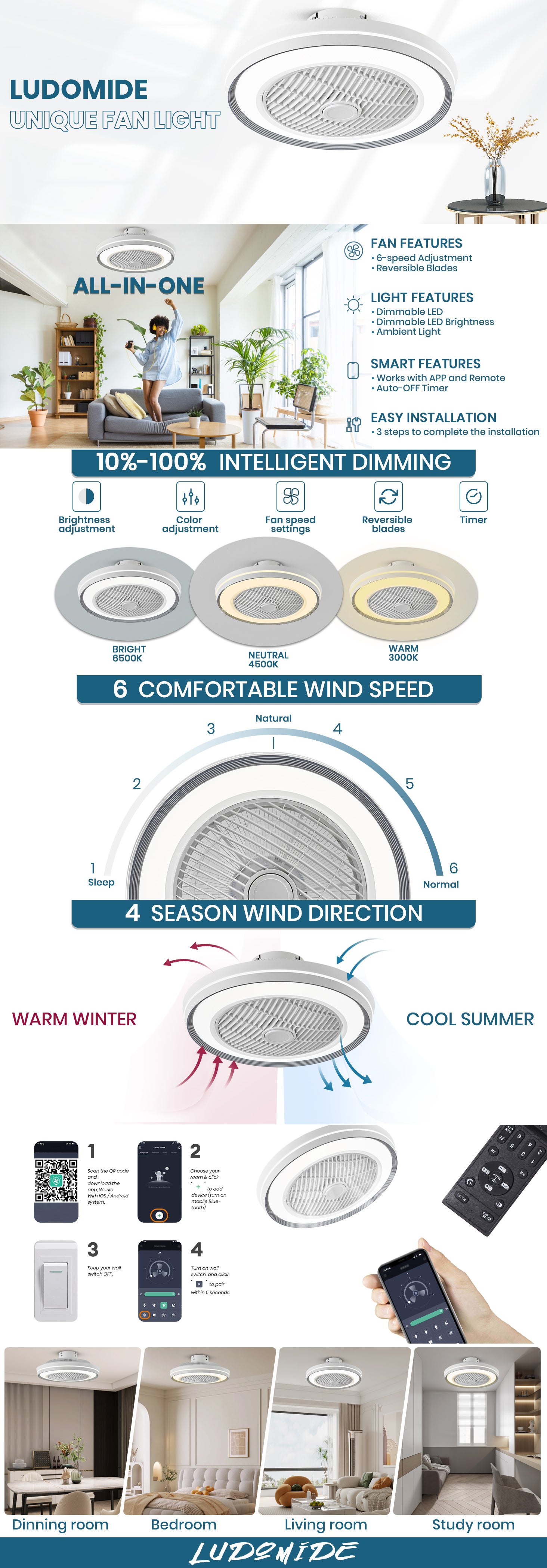 - 【Smart & High-Quality】High-sensitivity remote and APP control, one-key Timing (1/2/4/8H), 6 wind speeds, natural wind, night mode, 3 Color Change (3000-6500K), stepless dimming (10%-100%) and reversible function. Meet the needs of family members in all seasons!