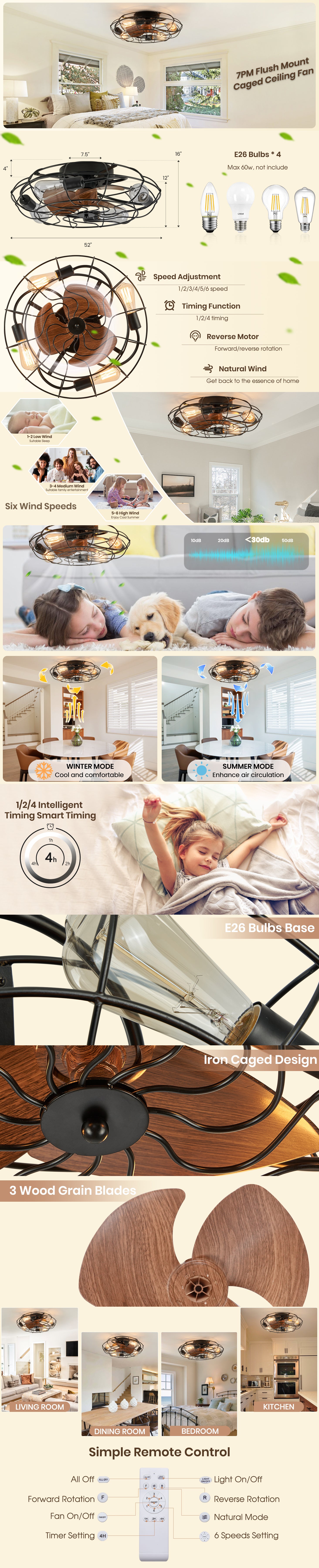 - 2-in-1 Design: The low profile ceiling fan is a combination of a fan and a light fixture. It features a classic industrial style design with a metal cage enclosure, providing a unique and stylish addition to any room.
