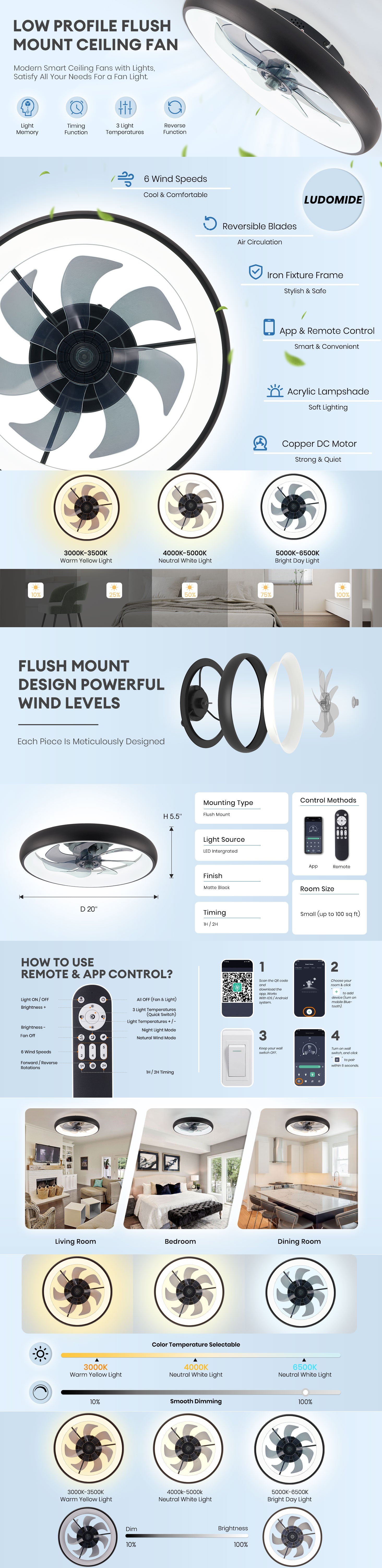 - 【Ultimate Convenience】: With our low profile ceiling fan, you'll enjoy the ultimate convenience of a range of cutting-edge functions. From App and remote control to light memory, natural wind function, stepless dimmable LED lighting, 3 light temperatures, 6 wind speeds, reverse function, and timing function, this flush mount fan light has everything you need to create the perfect atmosphere.