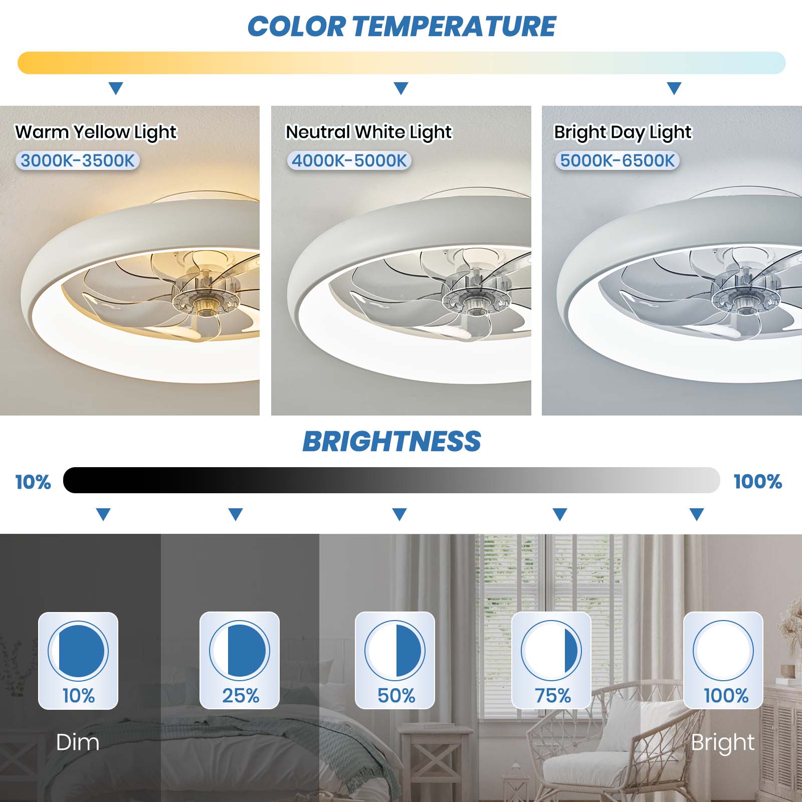 - 【Multifunctional】: Stepless Dimmable led brightness (10% - 100%), 3 color temperatures (3000K to 6000K), light memory function, night light mode, natural wind function, 6 wind speeds, and sleep timer setting. This flush mount ceiling fan can cater to your every need and create an ideal room atmosphere.