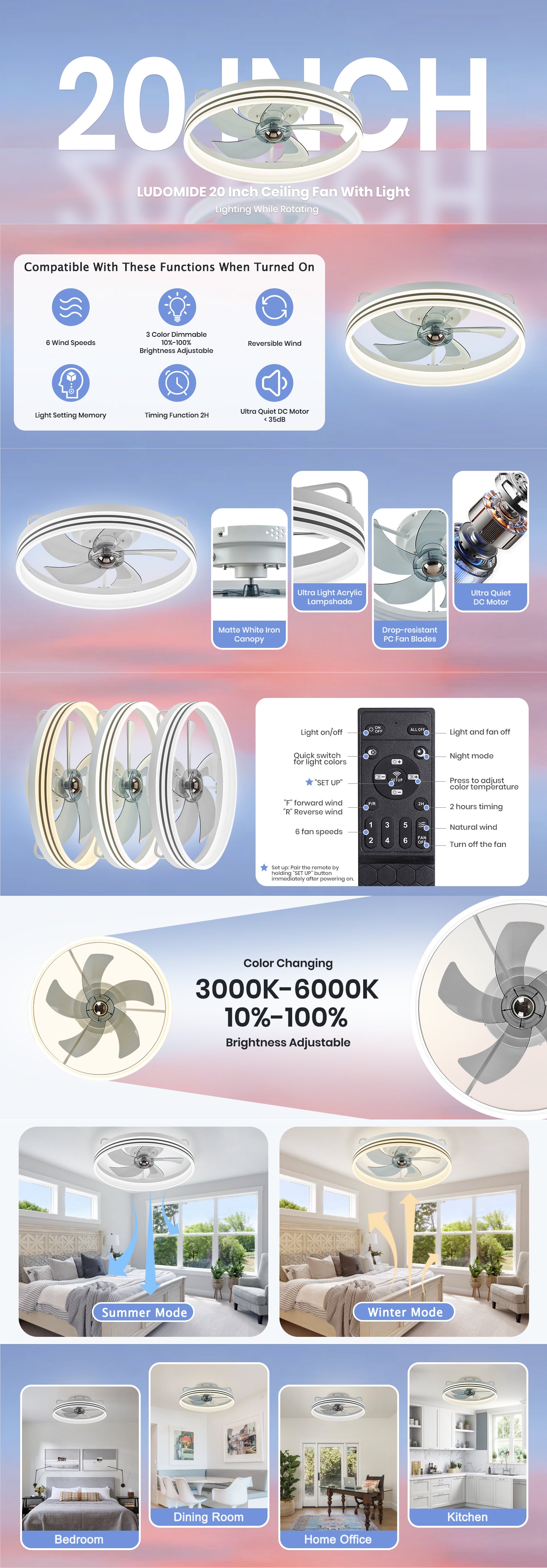 - 【Modern Ceiling Fans 2 in 1 Design】: 6 Wind Speeds + Timing Function + Reversible Wind + Memory Function + Dimmable LED Light. Modern low profile ceiling fan is designed with an LED light that adds to its sleek appearance, making it a great home decor item.