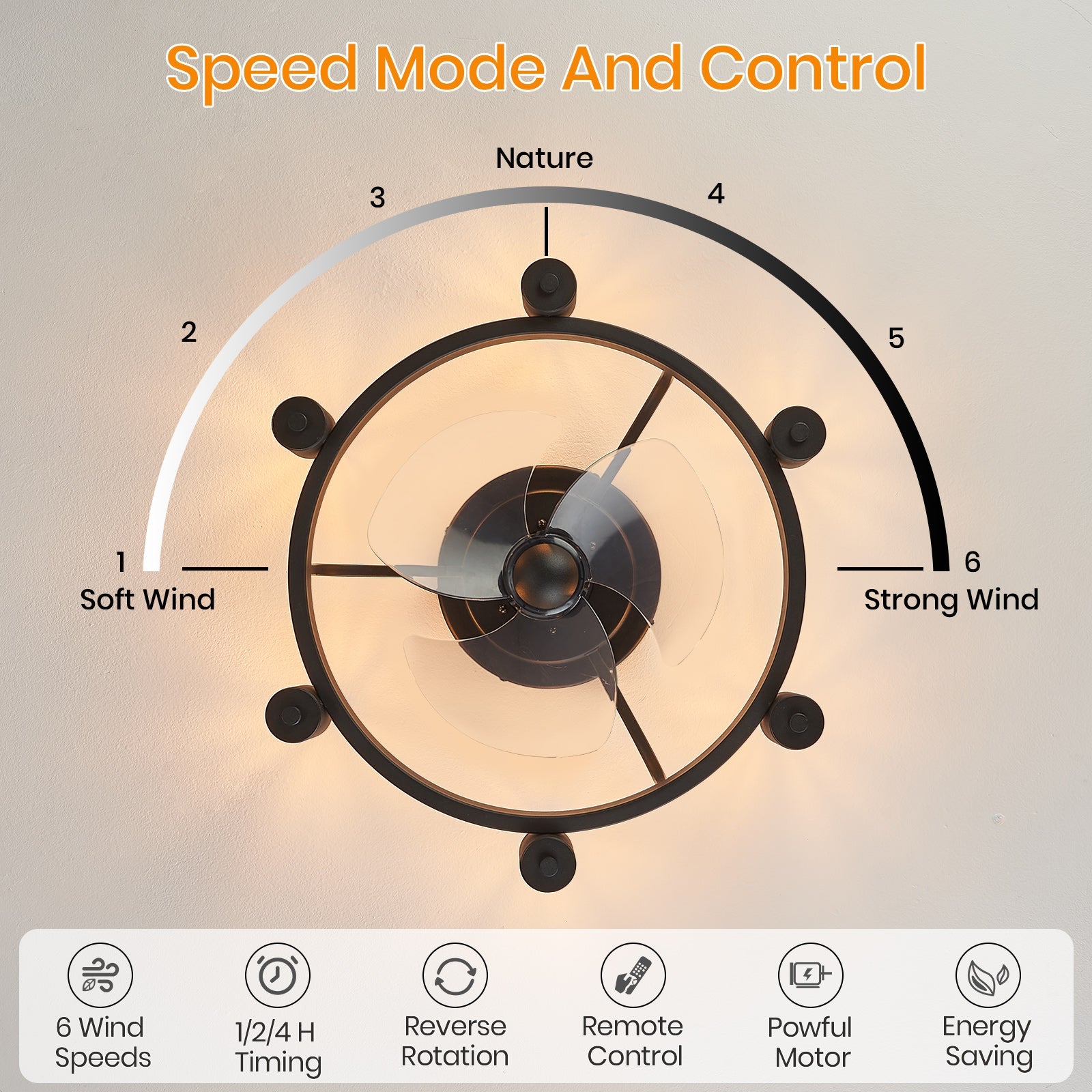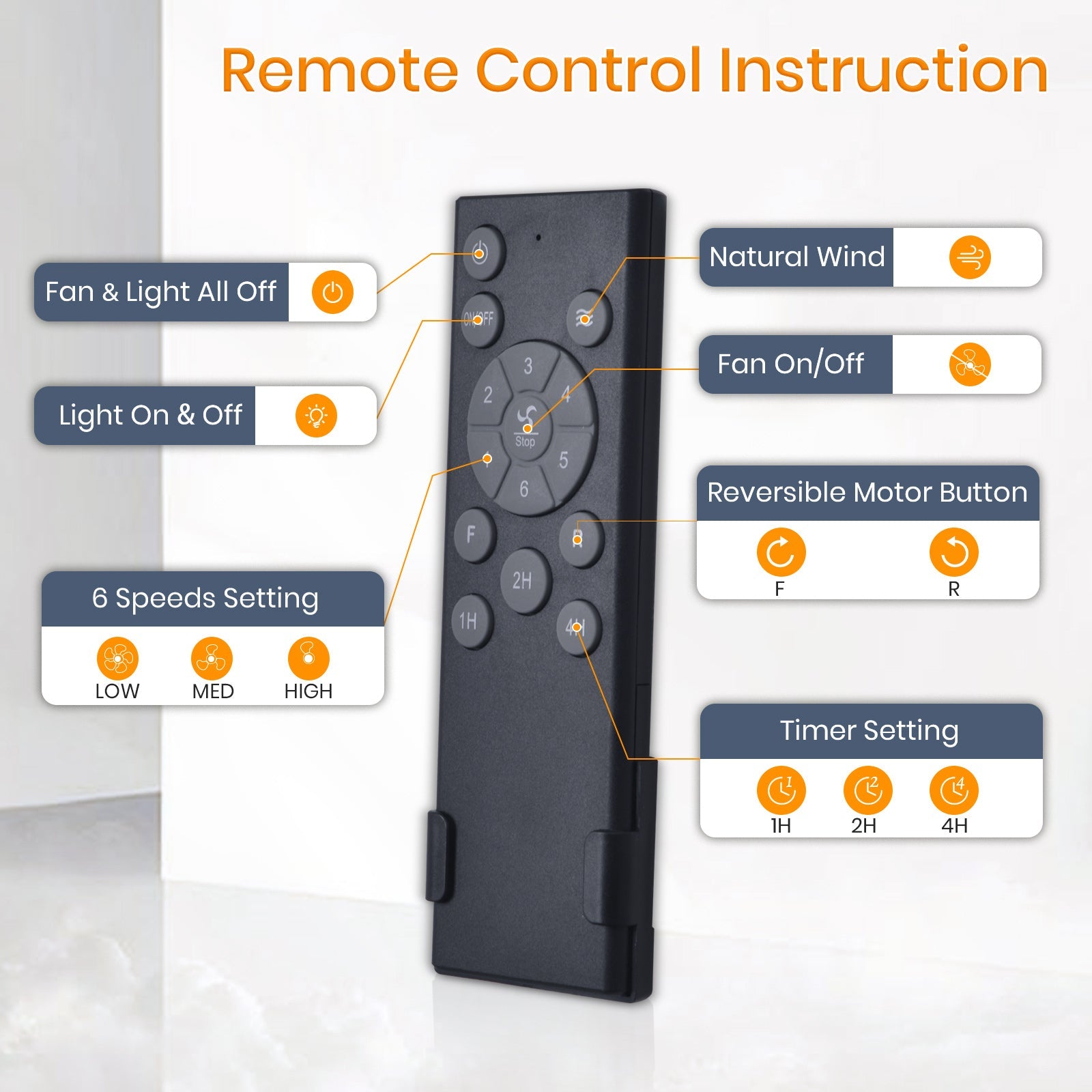 - 【Smart Ceiling Fan with Remote】All functions of this energy-saving ceiling fan are controlled by remote control, including 6 wind speeds, 1/2/4H time setting, reversible mode and natural wind. The fan or lighting can be turned on separately to meet the different needs of family members.