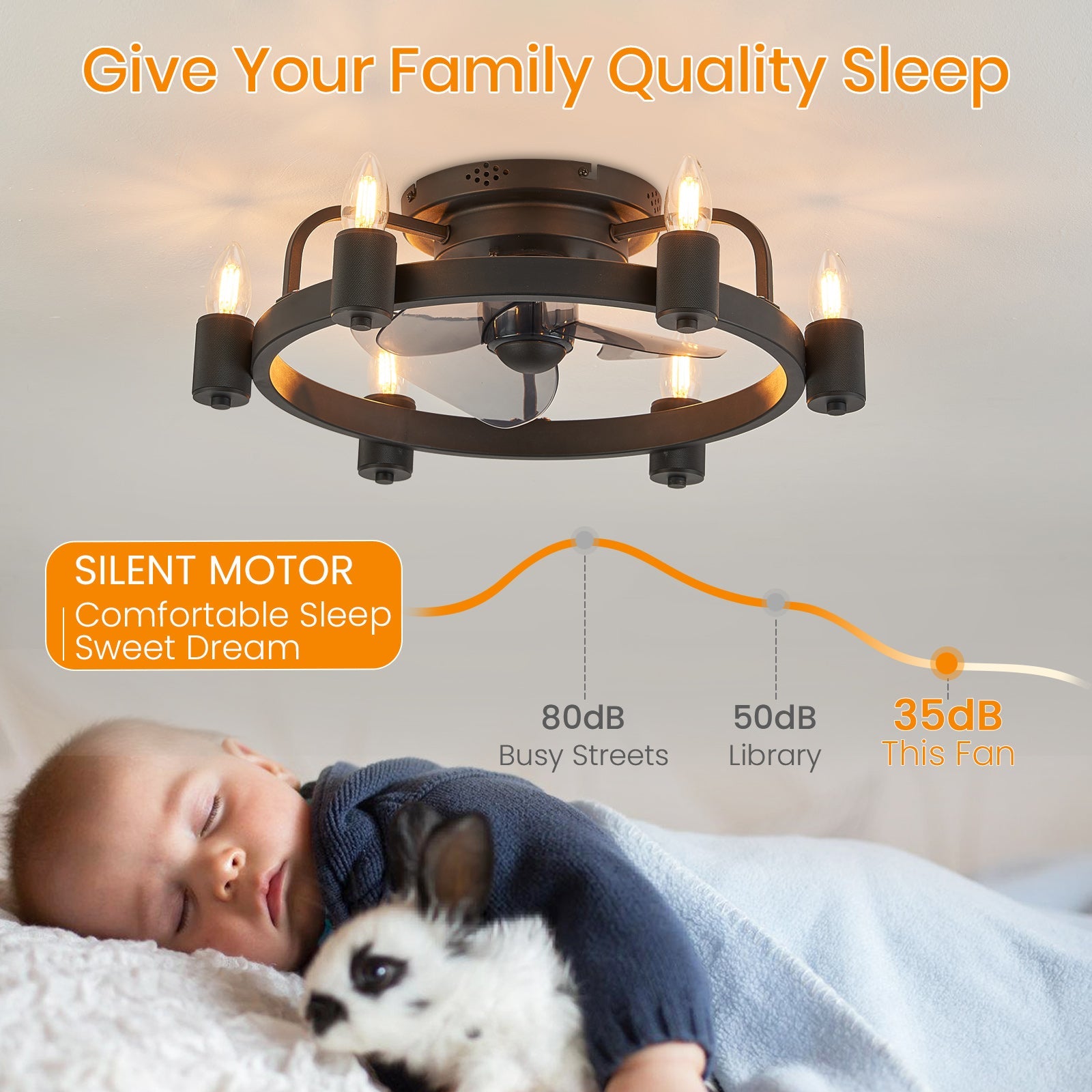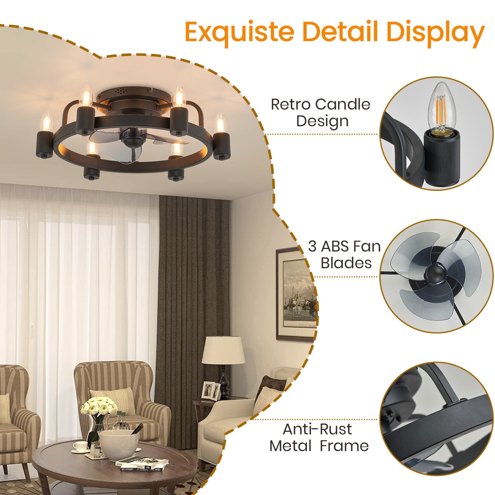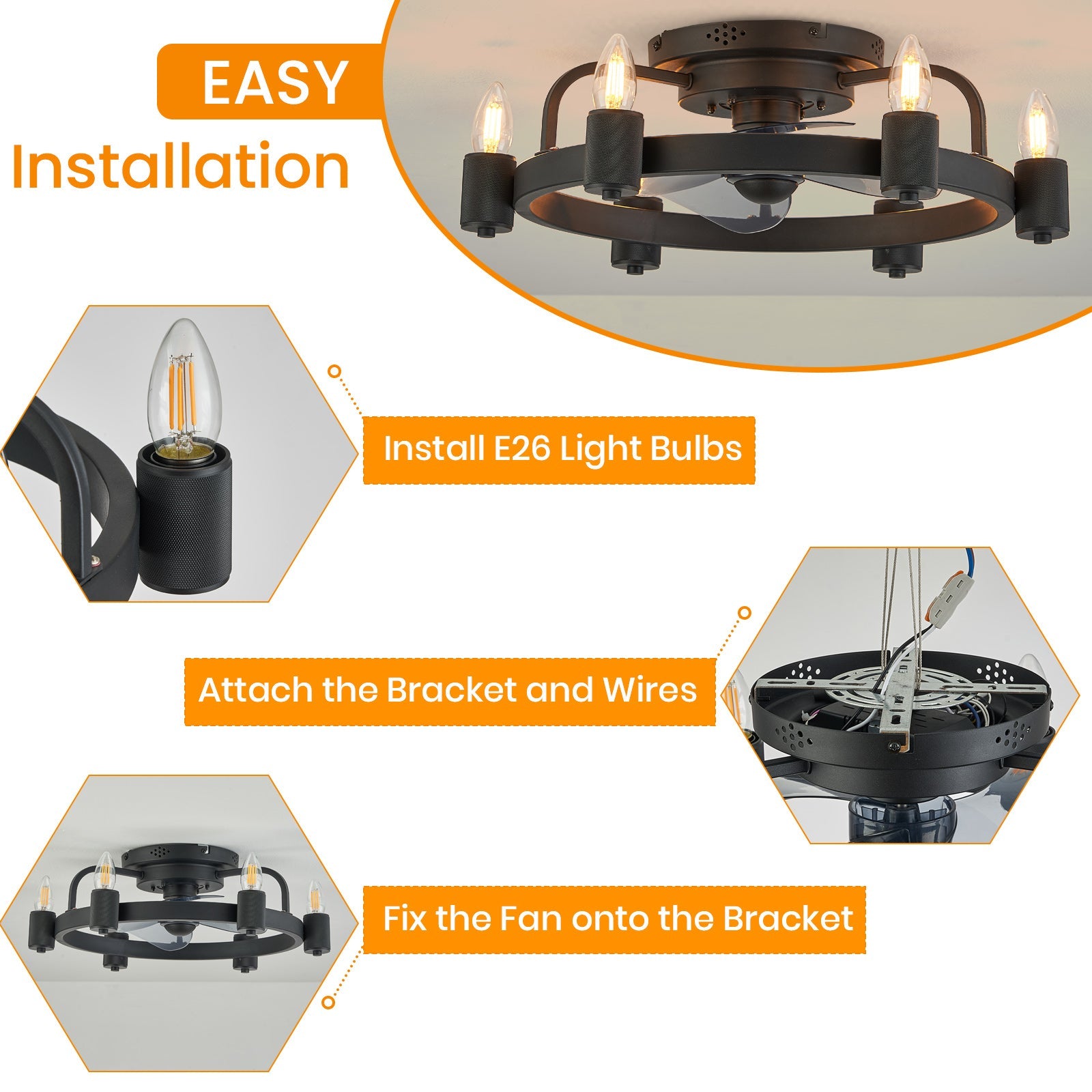 - 【Create Ambience】6 E26 bulbs are not included, so you can select the bulbs as you like. Compatible Bulbs: C35, A19, G45, T45, and other bulbs with a height below 4.3" (110mm). Open bottom design makes the flush mount ceiling fan easier to replace bulbs and clean.